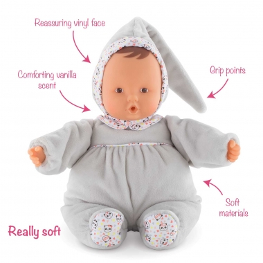 Babipouce: the iconic soft baby dollMy Babipouce soft baby doll is really soft. Of course, I'd rather be in Mum or Dad's arms, but when they're not there, I give Babipouce a big hug. He's so soft that I spend long moments resting my head against his. He's small (11") and light so I can grab him easily and take him with me everywhere, like a big boy or girl! But what I really like is when I get close to his realistic, reassuring face... I feel cocooned and comforted by a soft vanilla scent. Let me tell you a secret: I think that my parents like my Babipouce soft baby doll because it brings back lovely childhood memories for them. My Babipouce and I are inseparable. Because even if I leave it somewhere, it will be returned to me as it has a label for writing my name or my parents' telephone number. Machine washable, gentle cycle. mon doudou Corolle: Friends forever. From birth.