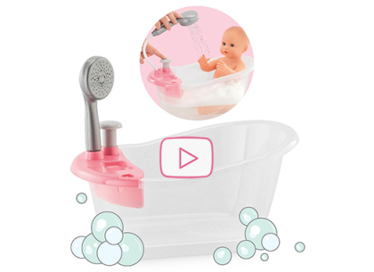 The Bathtub and Shower is the essential bathtime accessory for all dolls that can go in the water. It has a removable top with a button-activated shower head. When the tub is filled with water, push down on the button and use the shower attachment to bathe and rinse off a favorite doll. The bathtub and shower requires no batteries and is part of the Mon Grand Poupon Corolle Collection of dolls, fashions and accessories to help little ones take care of their baby doll the way their parents take care of them.